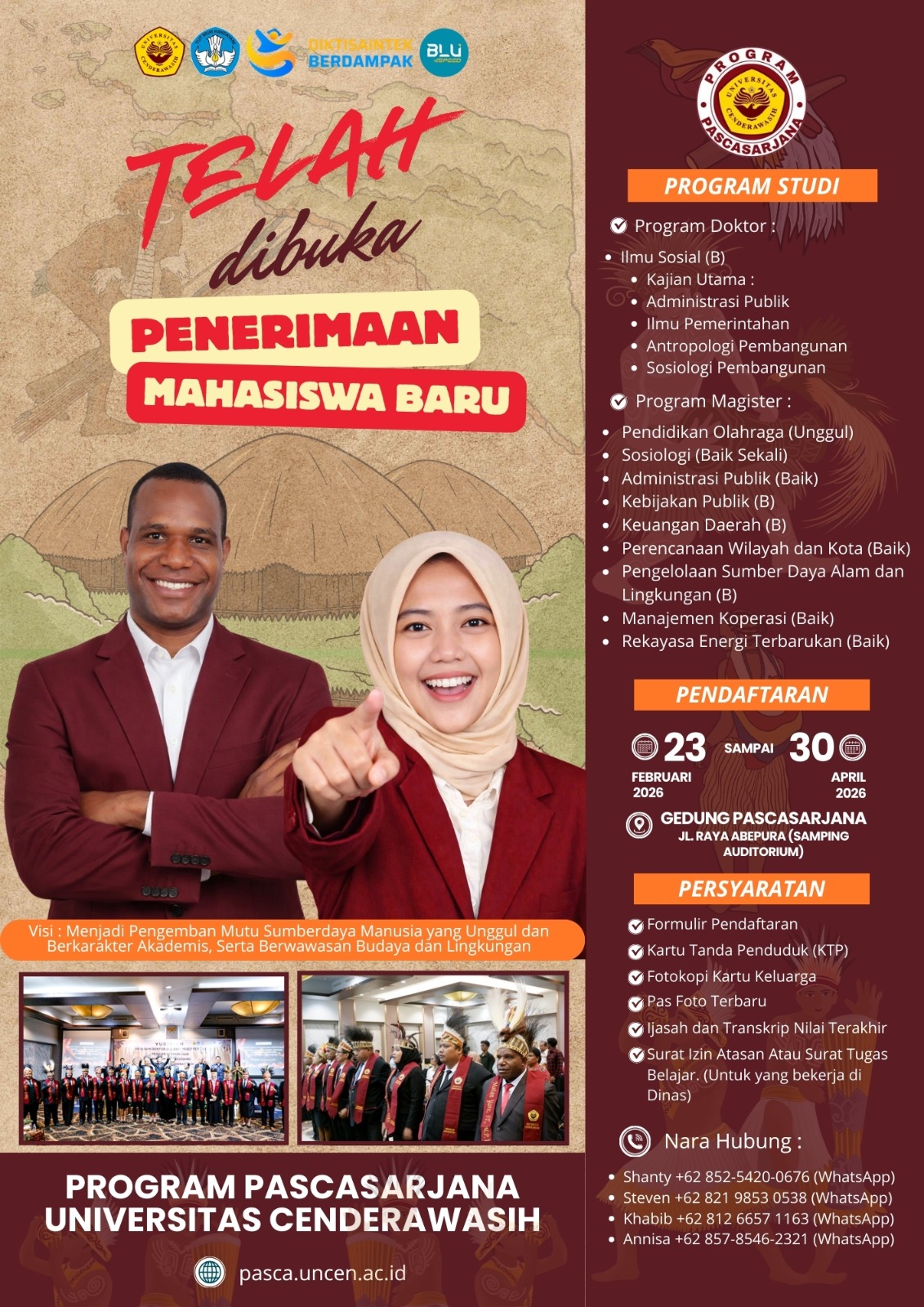 | 3. | Mengirim form pendaftaran dan berkas ke alamat email Program Doktor Ilmu Sosial : uncen.pdis@gmail.com atau Via WA Program Studi (+62 81247762820) |